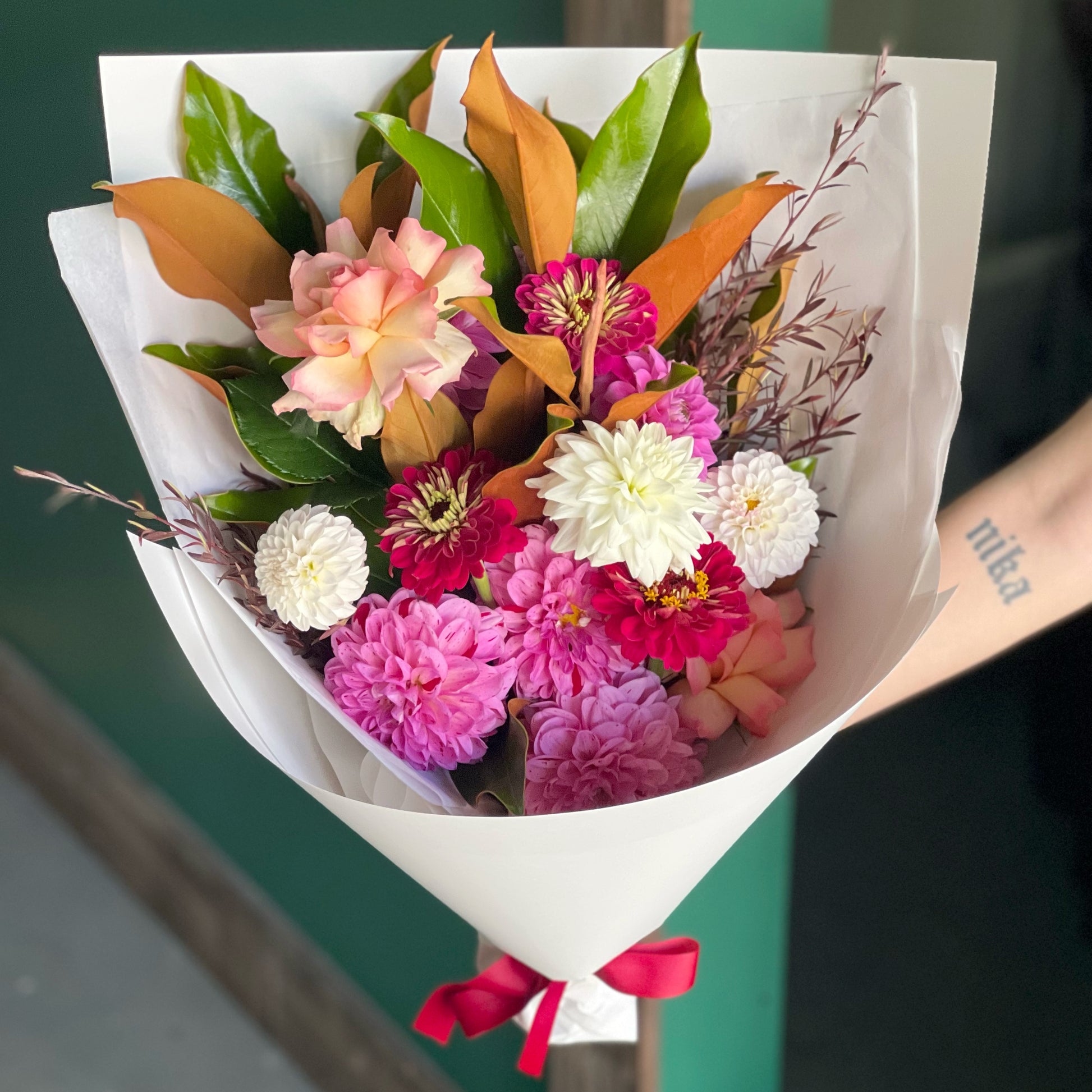 Our Flowers from our Farm bouquets are picked from our family flower farm in Silvan and sourced from other trusted local growers. Each bouquet is a Farmer’s Pick in gentle pink tones, wrapped simply in crisp white paper and finished with a Valentine’s Day bow.